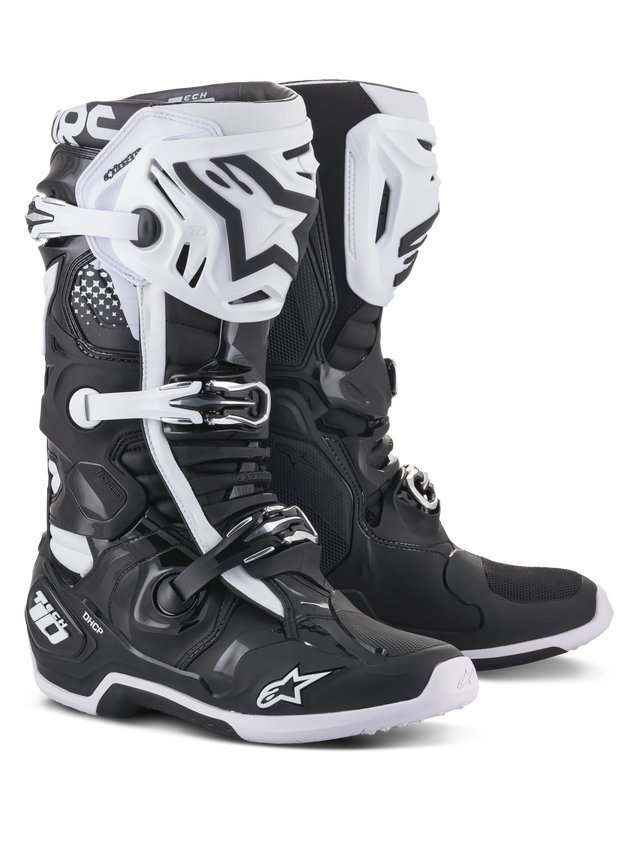 • Dual density TPU rear blade system engineered to prevent hyperextension while offering improved flex control and impact resistance. Built into the Tech 10’s unique and lightweight single-piece co-injected foot chassis is the patented Dynamic Heel Compression Protector (DHCP), an innovative safety feature which includes a fully integrated collapsible heel area with expanded poly-foam to absorb high impact energies during a crash. DCHP features a directional impact protection system which significantly reduces the effect of excessive, potentially injury-causing, energy being transferred to the ankle and lower leg. DHCP has been used by Alpinestars’ athletes in the demanding environments of professional Supercross and Motocross.