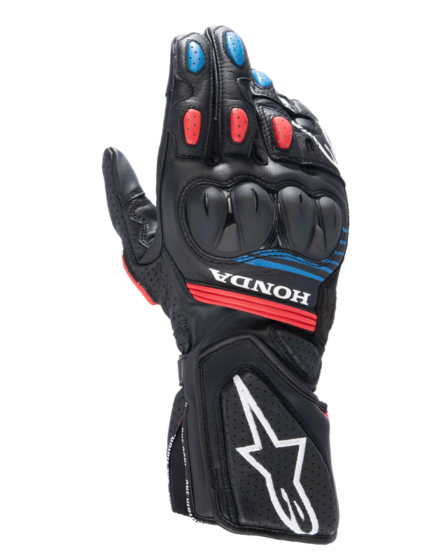 En universel kørehandske fyldt med racing-DNA for maksimal ydeevne, Honda SP-8 V3 Læderhandsker er konstrueret af meget slidstærkt, fuldkornet gedelæder og syntetisk lædermateriale. Takket være deres avancerede MotoGP-afledte SP dobbelt densitets knoebeskyttelse leverer SP-8 v3s høje niveauer af beskyttelse. Med en forformet fingerkonstruktion, en krog-og-løkke manchet lukning, og en ny anatomisk profileret grebsindsats på håndfladen og tommelfingeren, tilbyder Honda SP-8 V3 Handsker en sikker og meget personlig ydeevne kørepasform og høje niveauer af bevægelse og komfort til sportsryttere.